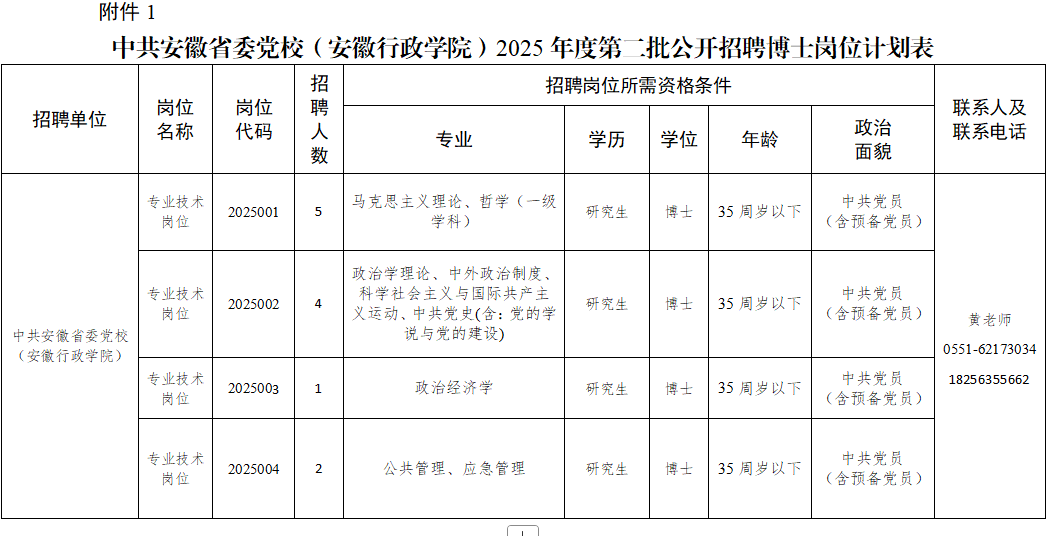 附件:1中共安徽省委黨校(安徽行政學院)2025年度第二批公開招聘博士崗位計劃表
