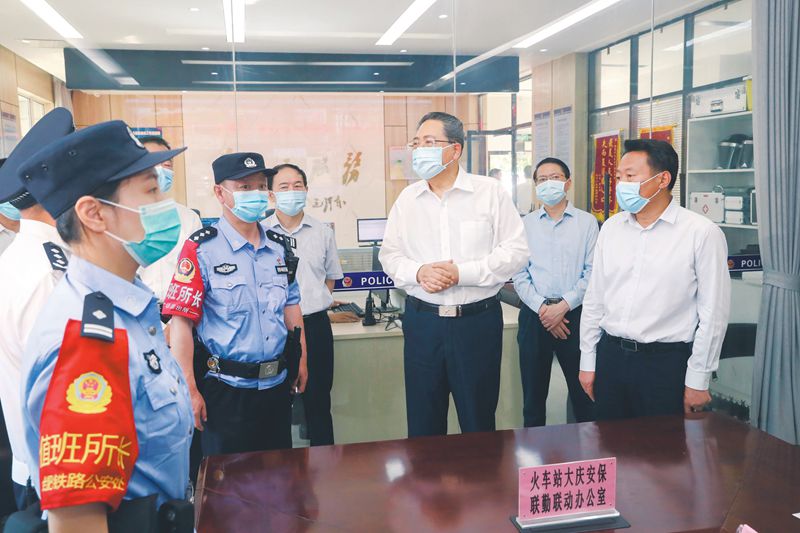6月24日上午,省委書記李錦斌深入合肥市,就做好當(dāng)前安全穩(wěn)定工作進(jìn)行調(diào)研督導(dǎo)。在合肥火車站綜合警務(wù)站,李錦斌詳細(xì)詢問路地聯(lián)勤、警力布置等情況,并親切看望基層干警,對(duì)他們堅(jiān)守崗位、忠誠履職,表示問候和感謝。 安徽日?qǐng)?bào)記者 徐國康 攝